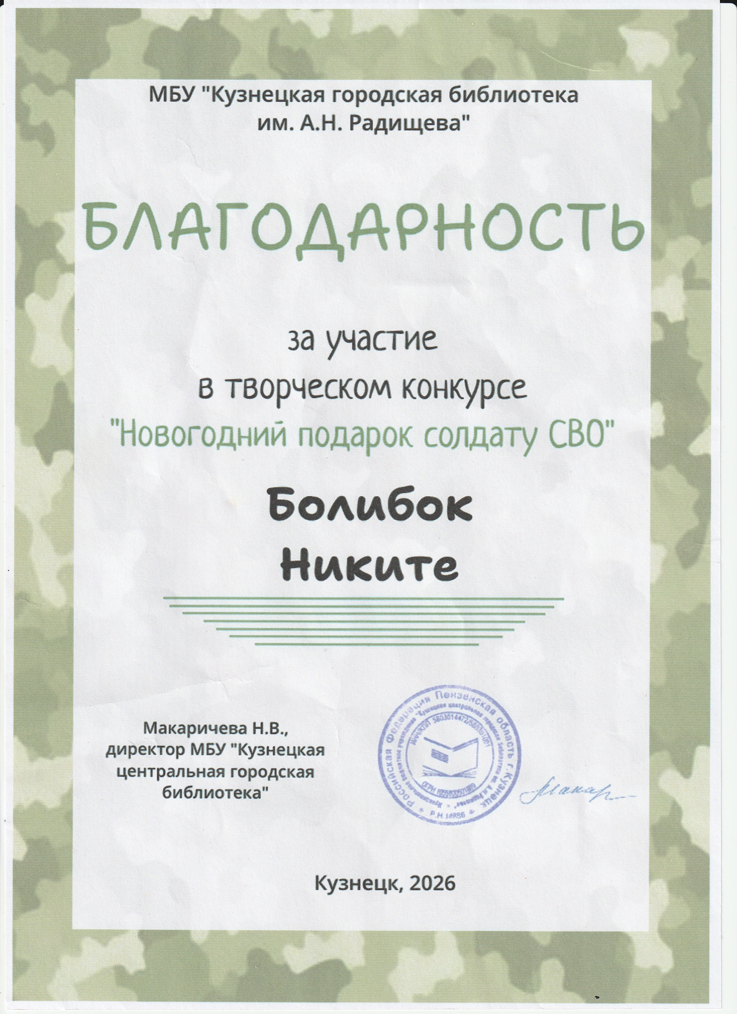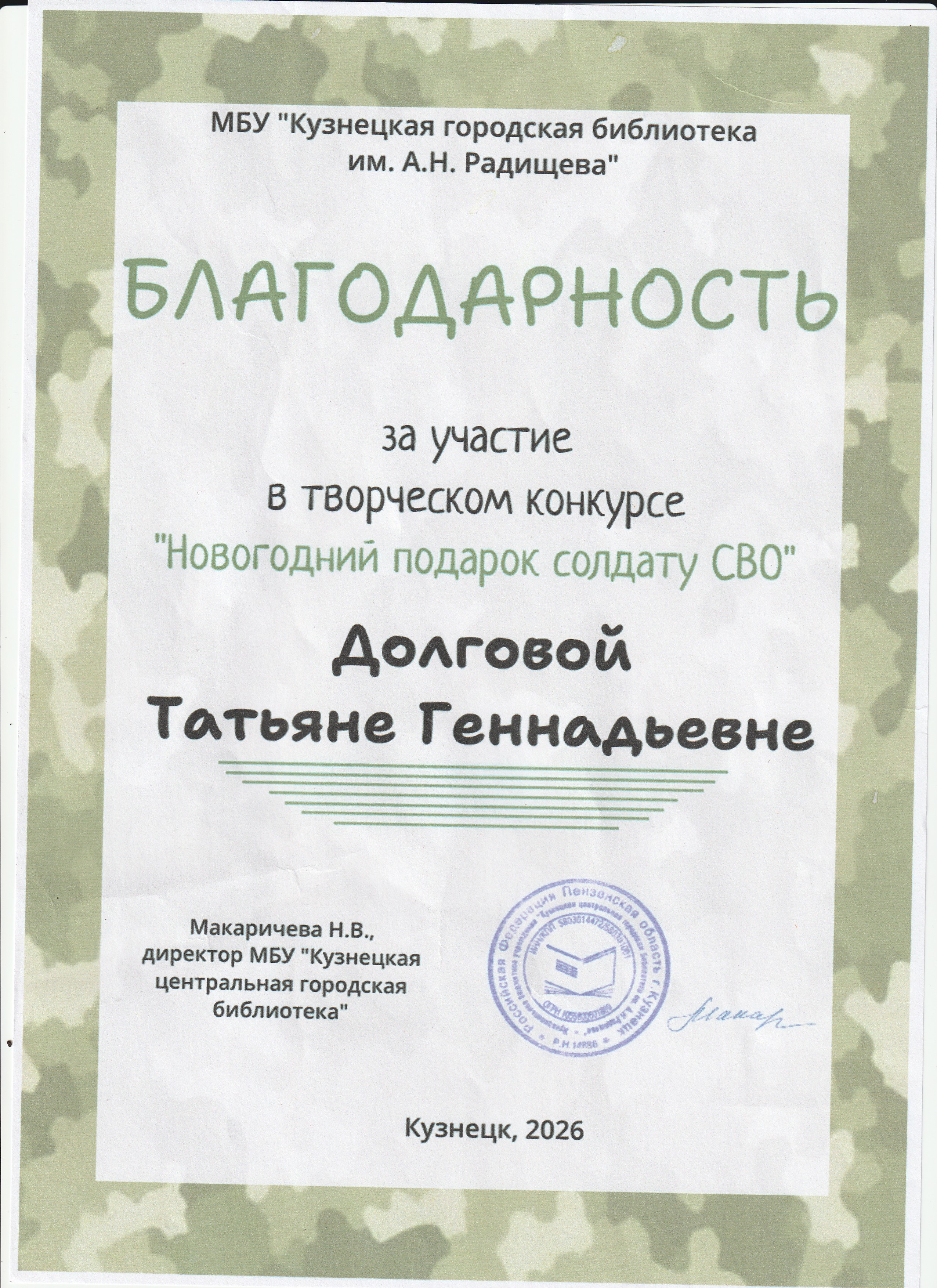 Благодарность за участие в творческом конкурсе "Новогодний подарок солдату на СВО"